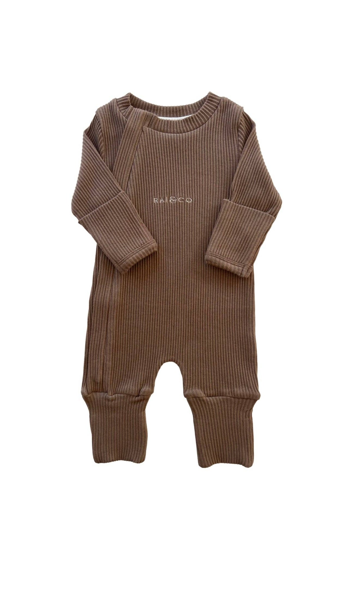 This thick embroidered ribbed cotton jumpsuit allows for ease of movement. Designed with a higher neck and windproof feet for those cooler winter months. The hidden side two-way zip allows for those easy nappy changes without your little babe getting cold.