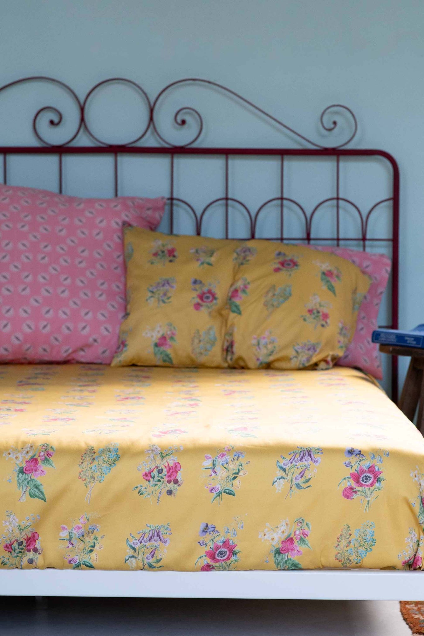 This design is based on a combination of botanic illustrations on a background of mustard yellow. Digital print on Fair Trade organic cotton sateen 48cm x 72cm (19" x 28.5") SET OF 2 pillowcases without ties Made in India