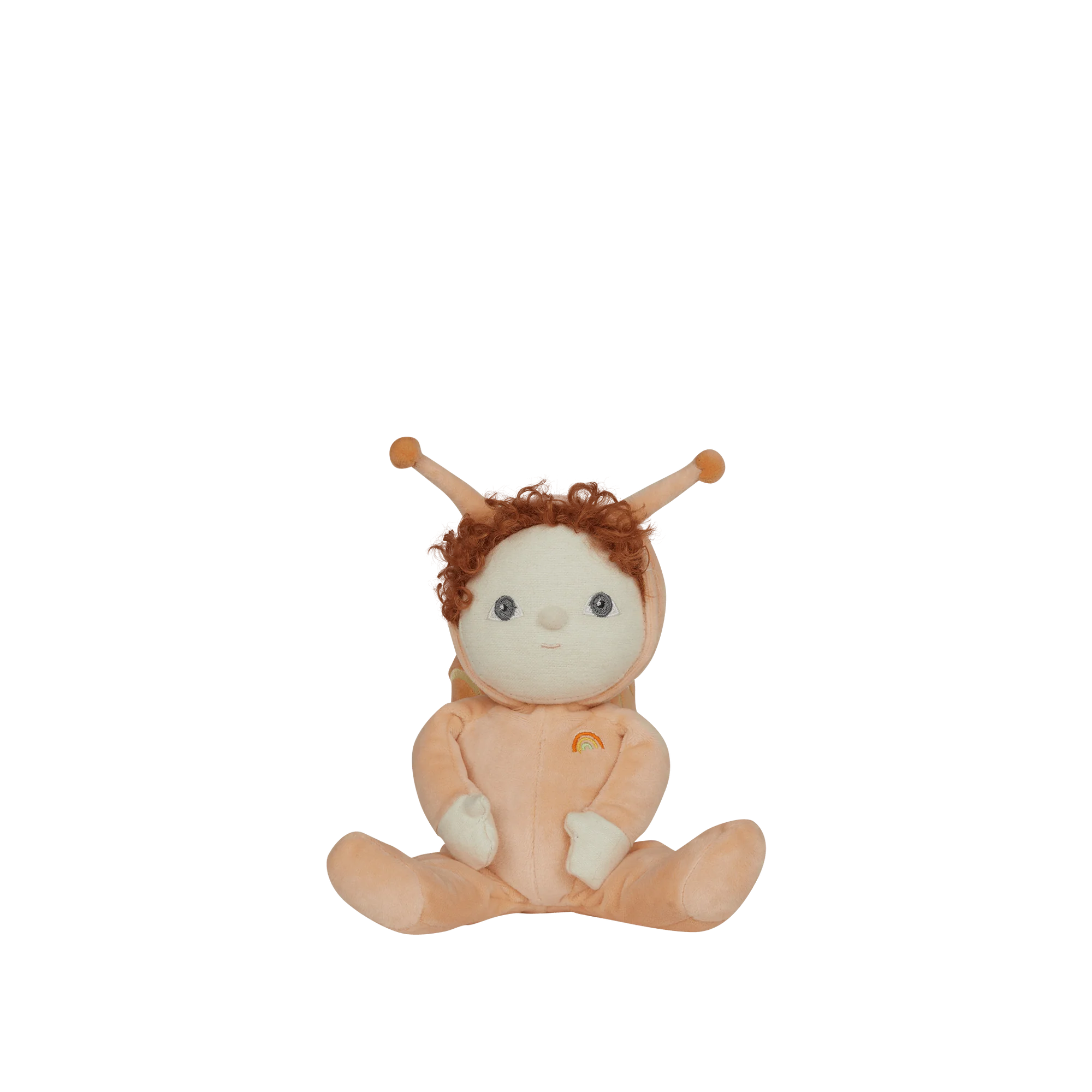 In a soft, velvety orange jumpsuit with matching hood and antennae, Scottie is the epitome of warmth and comfort. Rich, fiery orange curls and ashy hazel eyes are a soft contrast to the big, swirling snail shell on his back, which boasts a delightful yellow embroidery. With a gentle presence and laid-back style, Scottie is the perfect companion for little ones who love to slow down, snuggle, and enjoy the quiet moments.