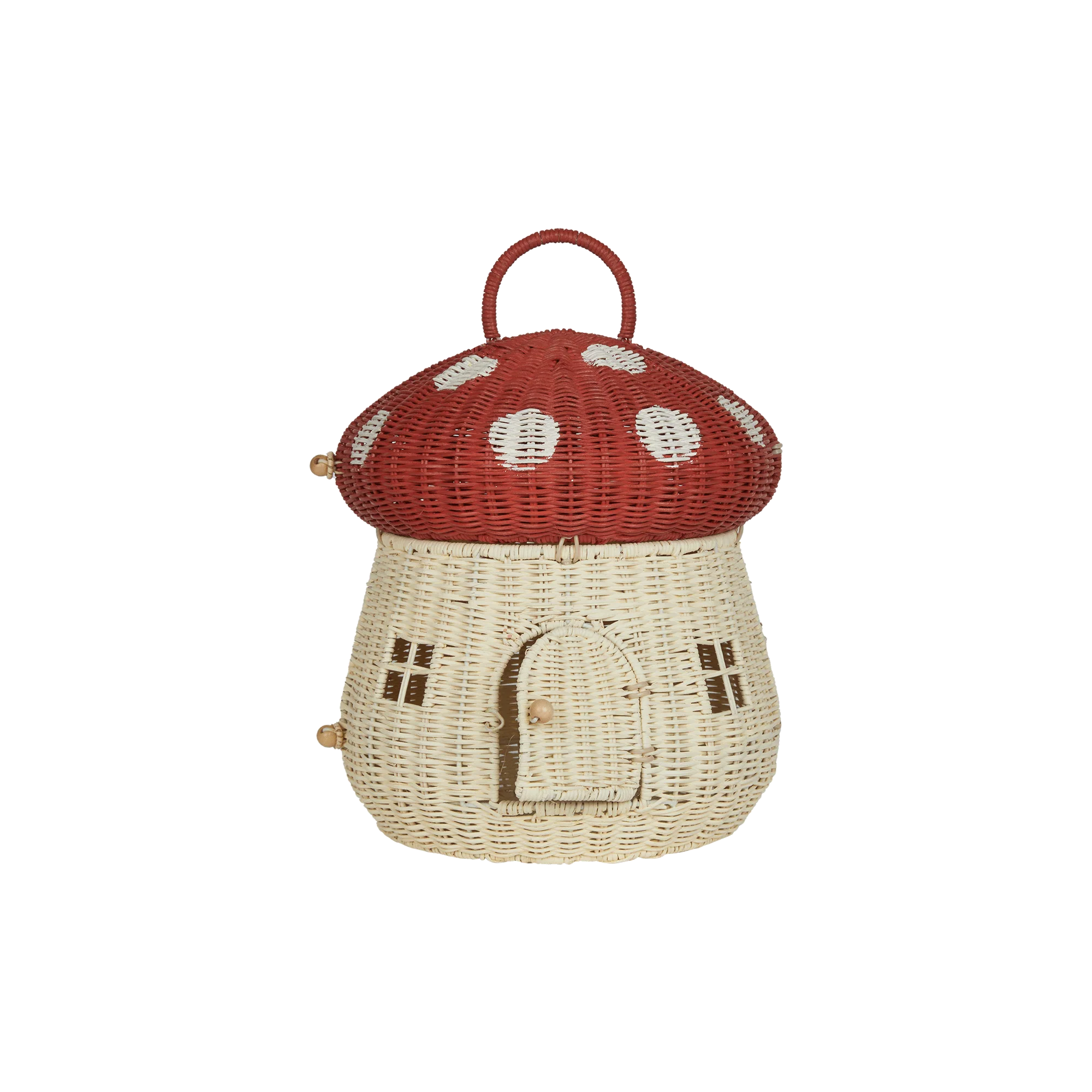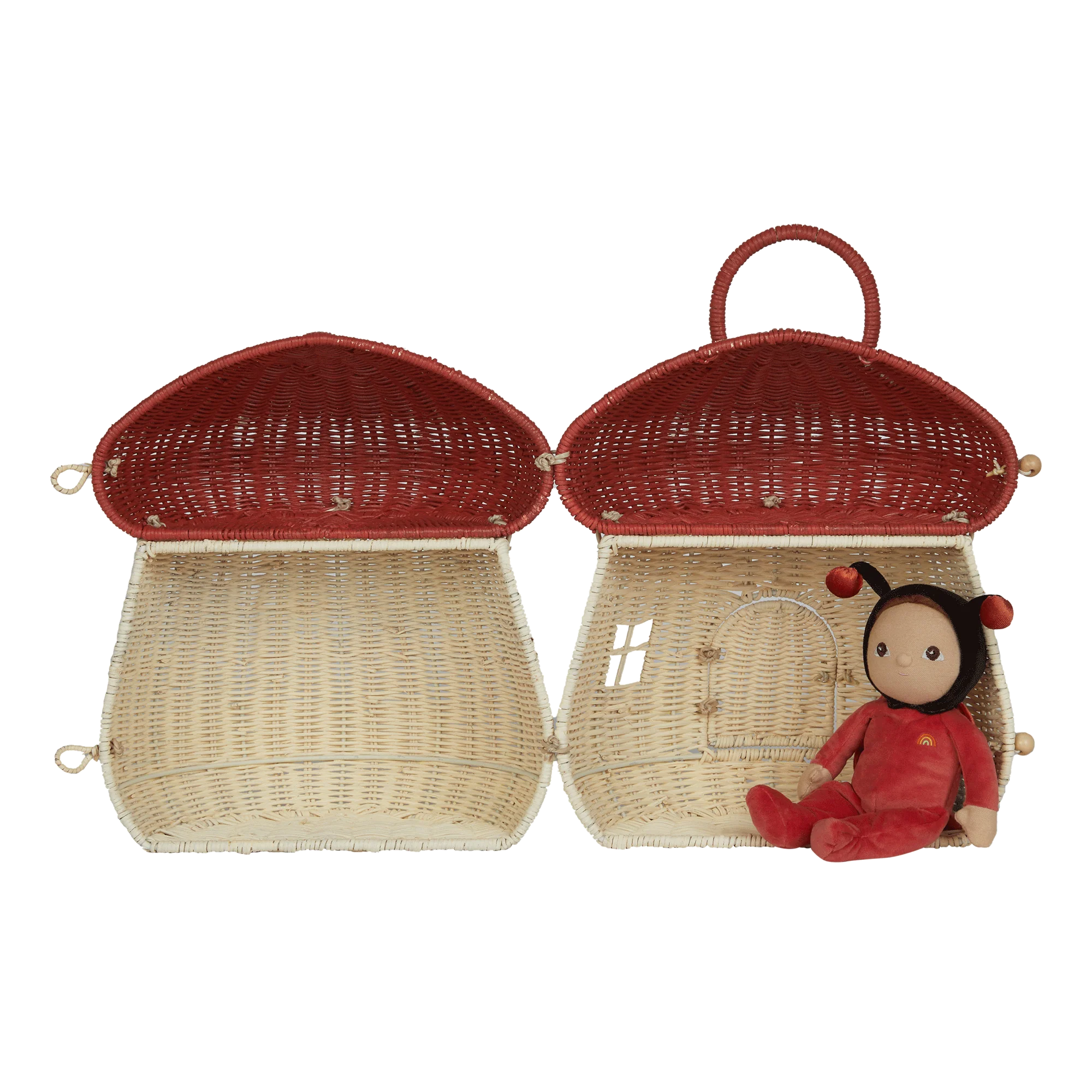 A whimsical home for tiny adventurers, the Mushroom Doll House in Red is the perfect place for your little ones’ Holdie Folk or Dinky Dinkums to settle in for imaginative play. Handwoven from natural rattan, this mushroom-shaped house features two cozy levels, one on the ground floor and a charming shelf that creates a second floor.