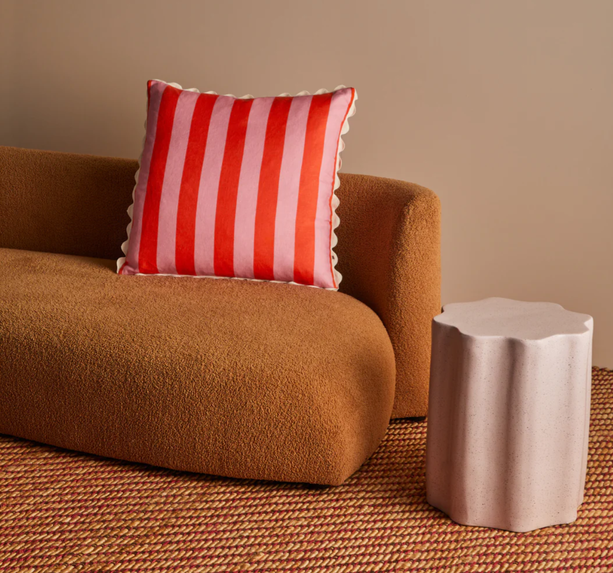 Inspired by the sweet tones of summer, this linen cushion pairs soft pink and orange in a retro stripe. Playful yet versatile, it works beautifully with both florals and solids.