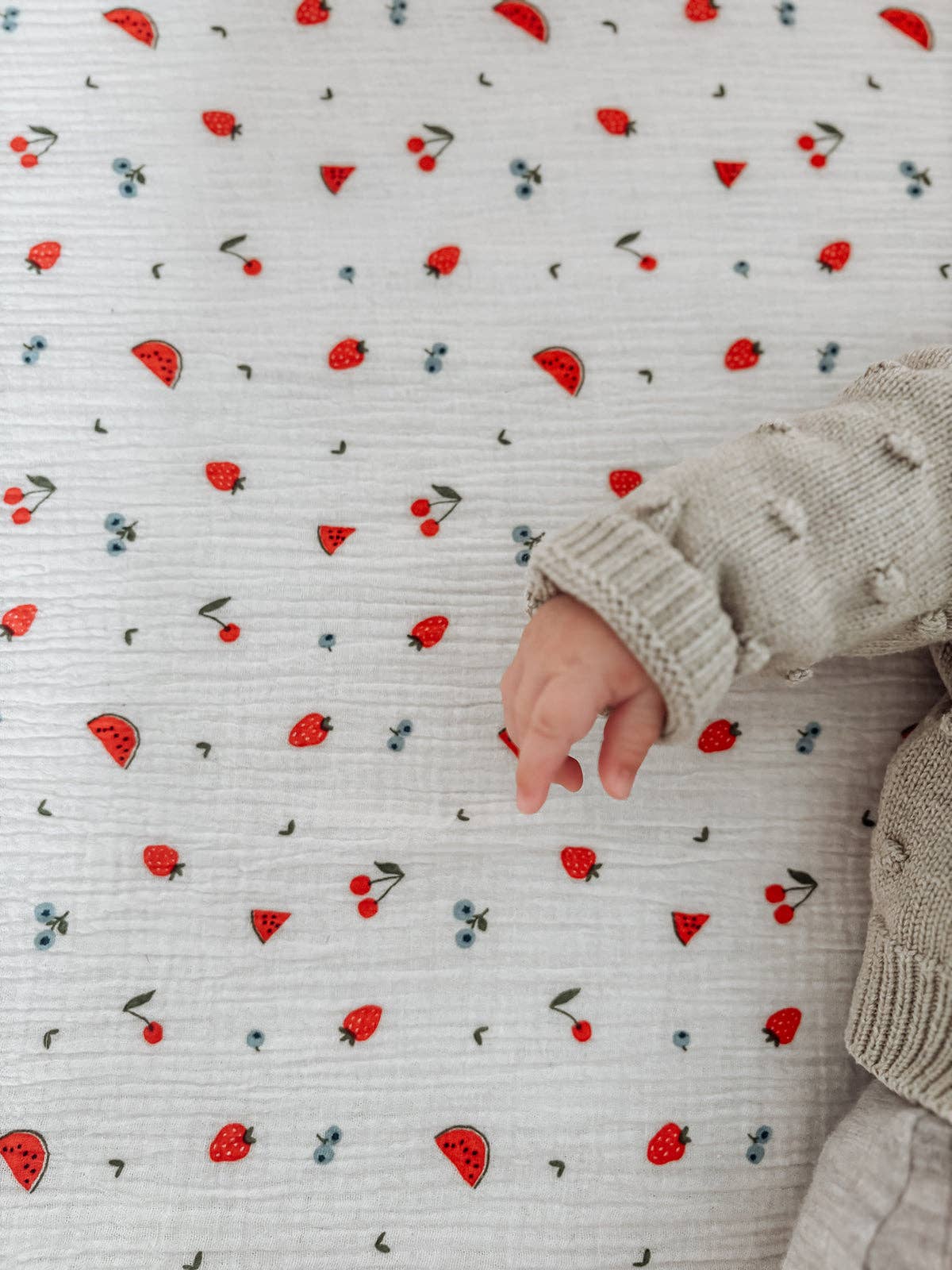 This fitted cot sheet is made from GOTS certified organic cotton muslin. Muslin is soft, lightweight, and breathable, making it ideal for a cot sheet.