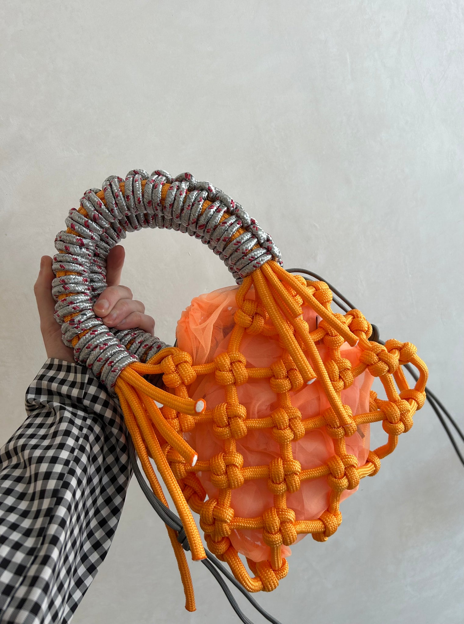 Orange macrame rope bag with silver handle (with red flecks) and an orange pouch.