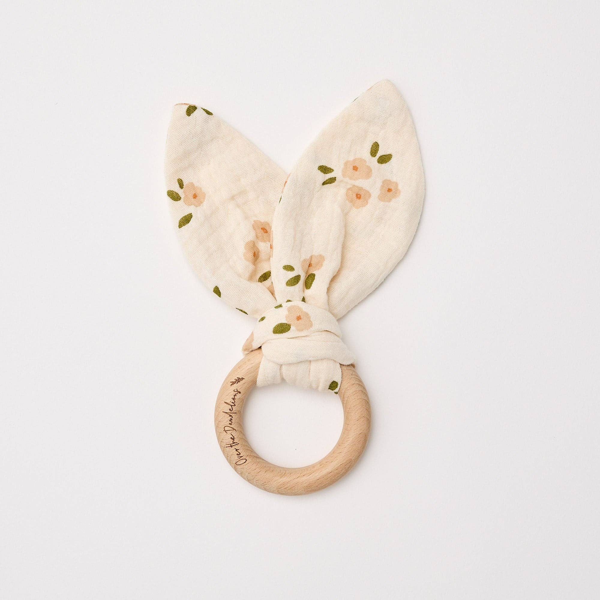 Little mouths love exploring the natural texture of the wood ring and chewing on it can help to relieve the pain of teething. The muslin ears make a lovely sensory item as they are very soft and comforting.