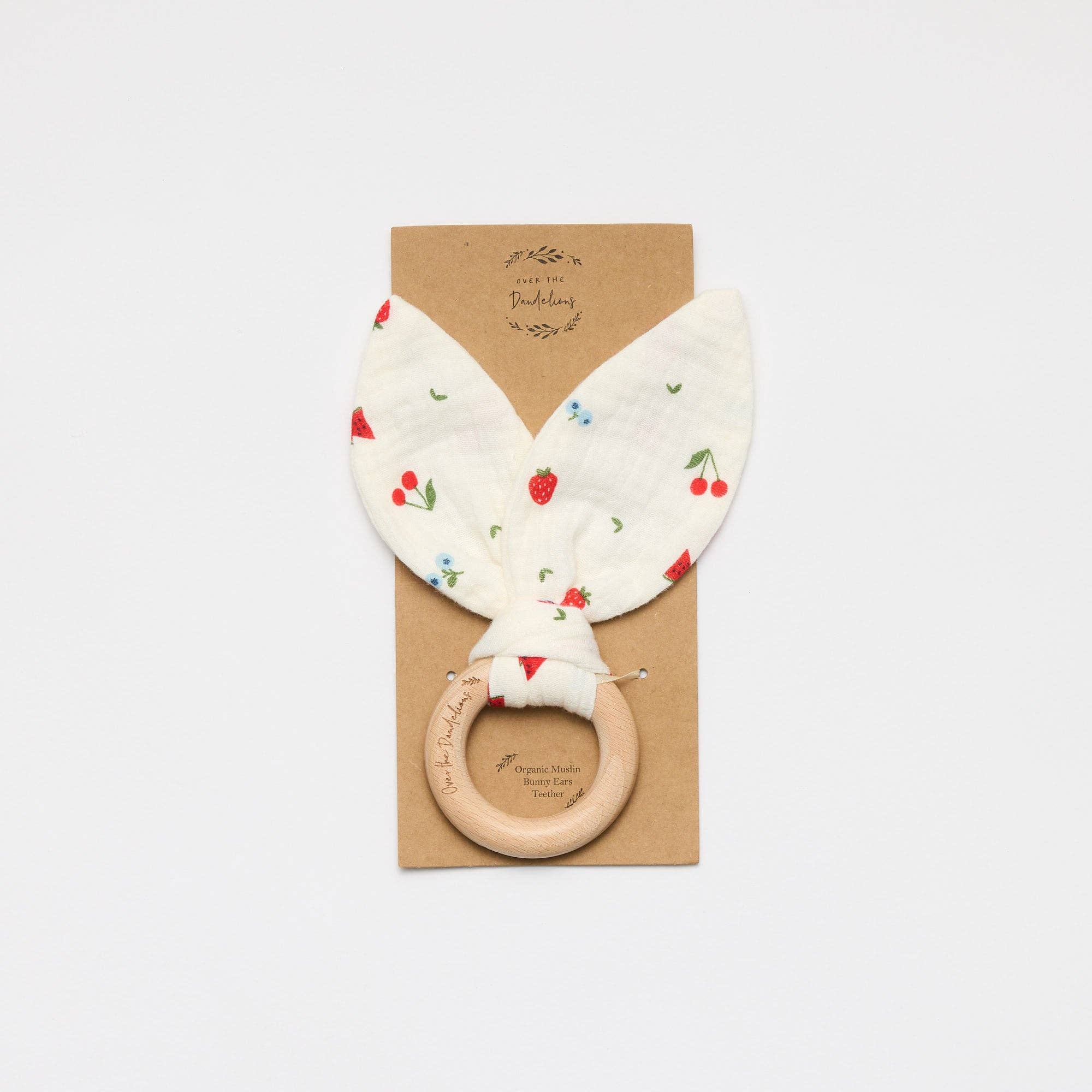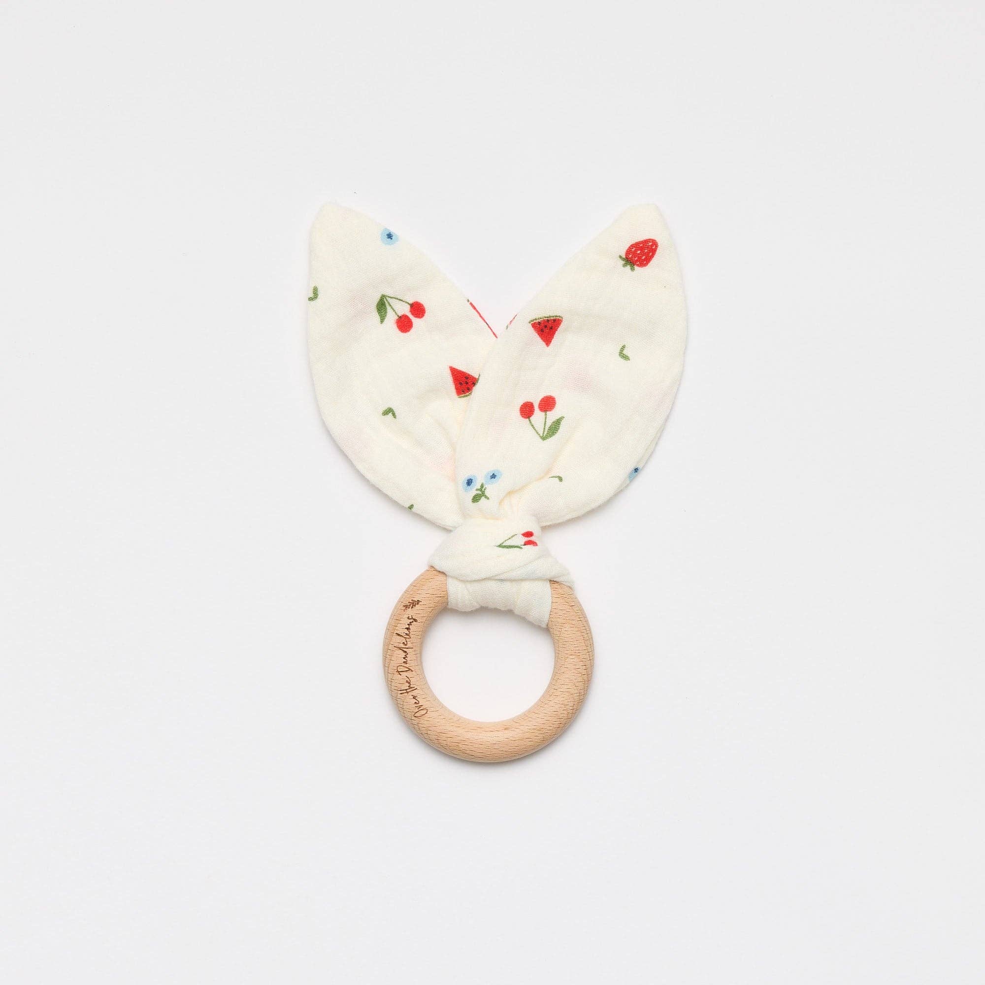 Little mouths love exploring the natural texture of the wood ring and chewing on it can help to relieve the pain of teething. The muslin ears make a lovely sensory item as they are very soft and comforting.