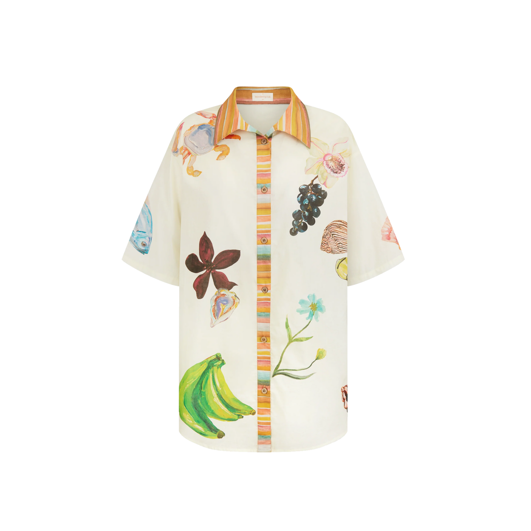 Our Seaside shirt is part of our Artist Series, featuring Annie Everingham’s hand-painted artwork. Painterly oysters, bananas, fish, flowers, and crabs dance across the fabric in expressive brushstrokes, capturing the quiet magic of the seaside. A soft watercolour-striped placket and collar add a beautifully unexpected contrast, all printed on lightweight organic cotton.
