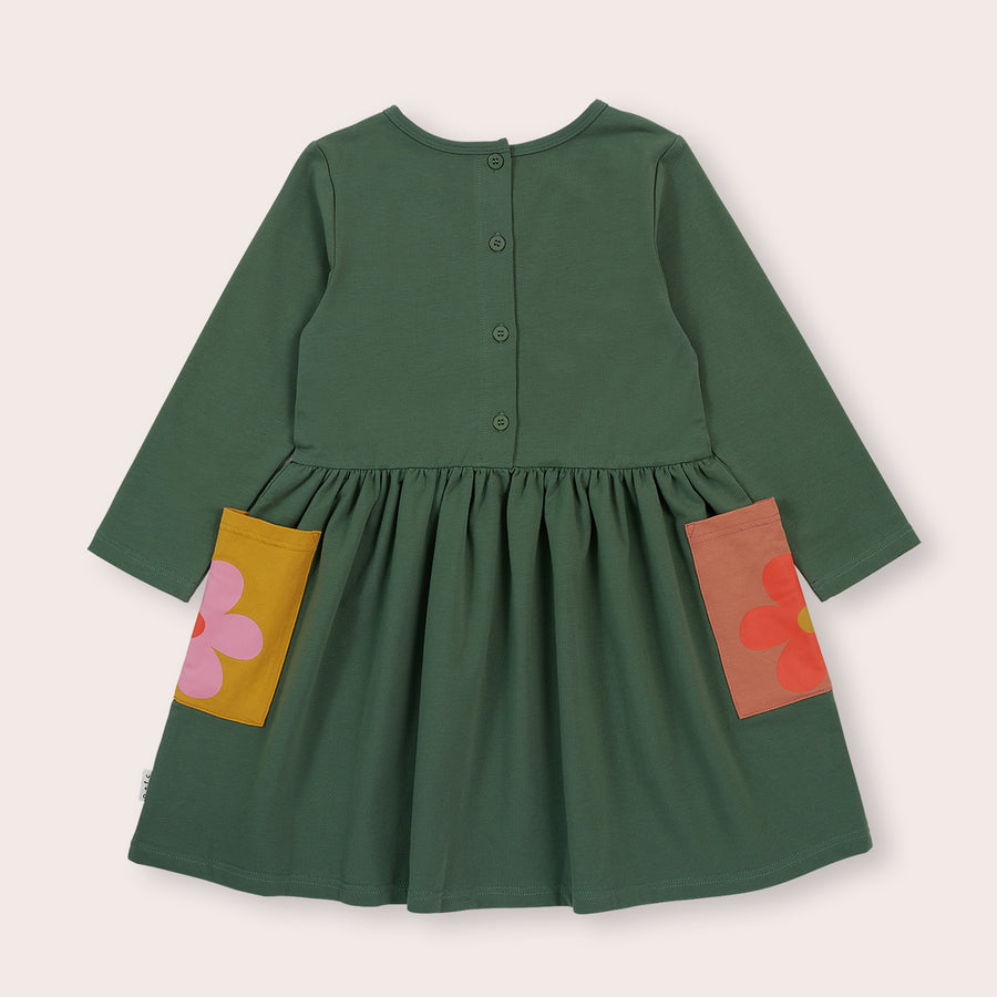 Our most popular dress style but with long sleeves. Featuring buttons down the back for easy dressing, large pockets in contrast colours with fun flower print and a twirl-worthy skirt.